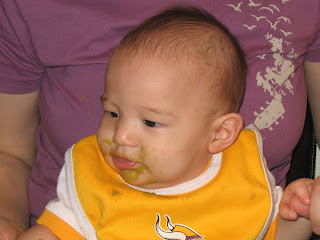 After a trip to the grocery store, it was time to continue our out of a jar gastronomical education. Sweet potatoes? In the rear-view mirror, baby! The new week kicks off with peas. Guster got his first bite of peas today -- or at least the mush that bills itself as peas. As was the case with the sweet potatoes, there was an initial grimace, followed by Gus quickly deciding that peas (not pork) was what's for dinner. I think he ate most -- if not all -- of the entire jar. He's a good eater. Sorry, once again, for an insufferably terrible pun.